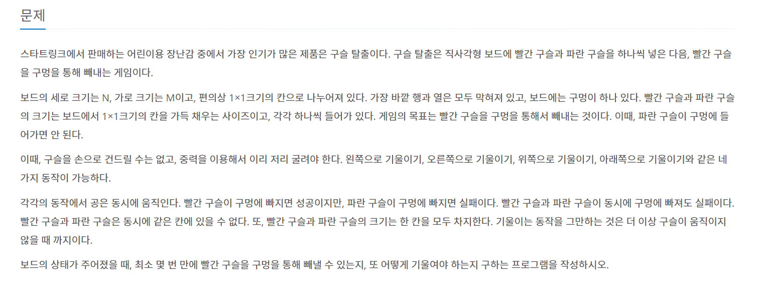 문제 링크입니다 https://www.acmicpc.net/problem/13460 13460번: 구슬 탈출 2 첫 번째 줄에는 보드의 세로, 가로 크기를 의미하는 두 정수 N, M (3 ≤ N, M ≤ 10)이 주어진다. 다음 N개의 줄에 보드의 모양을..