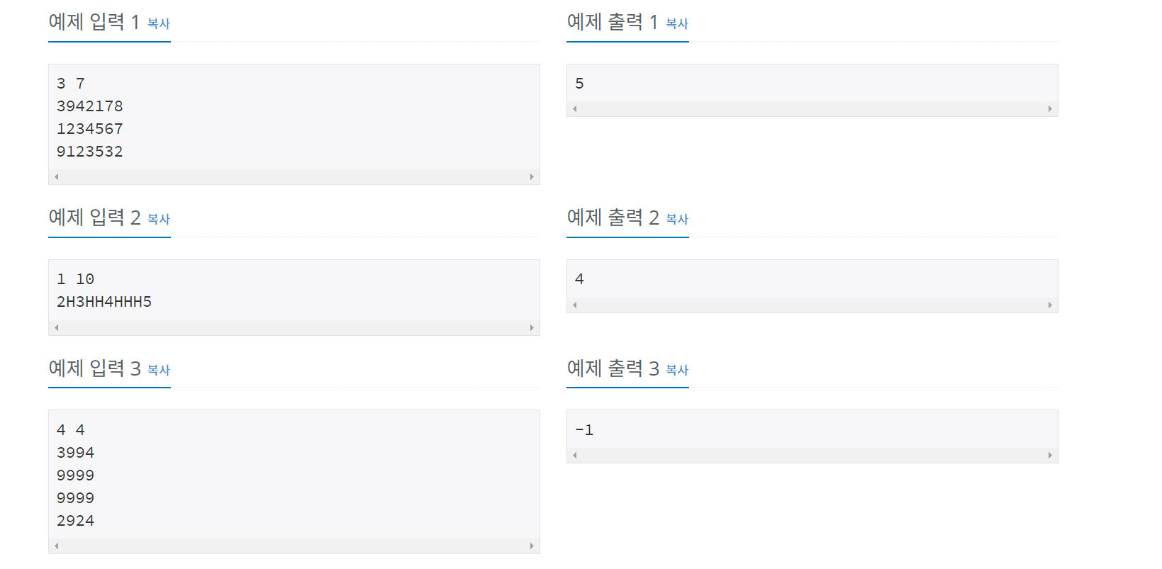 줄에 보드의 세로 크기 N과 가로 크기 M이 주어진다. 이 값은 모두 50보다 작거나 같은 자연수이다. 둘째 줄부터 N개의 줄에 보드의 상태가 주어진다. 쓰여 있는 숫자는 1부터 9까지의 자연수 또는