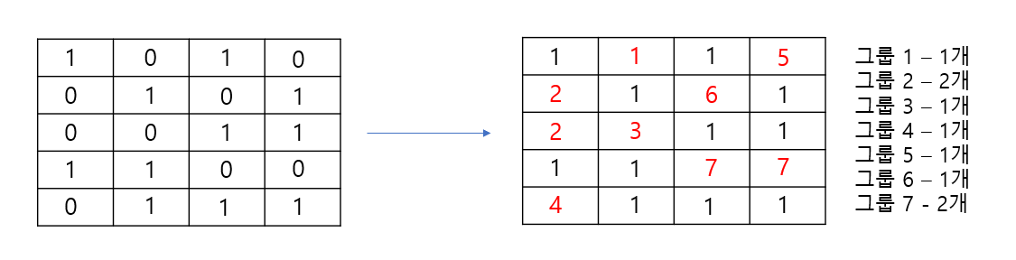 해당 벽에서 상하좌우 탐색을 통해서 붙어있는 그룹 번호를 저장한뒤, 해당 그룹의 값 만큼 더해주면 됩니다. 이때 그룹은 한번씩만 더해줘야 한다는 것을 주의해야합니다.