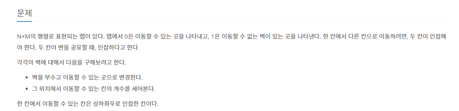 N*M의 값이 주어졌을 때, (i , j) 칸의 벽을 부셨을 때, 해당 칸에서 이동할 수 있는 곳은 몇 칸인지를 물어보는 문제입니다.