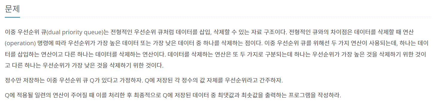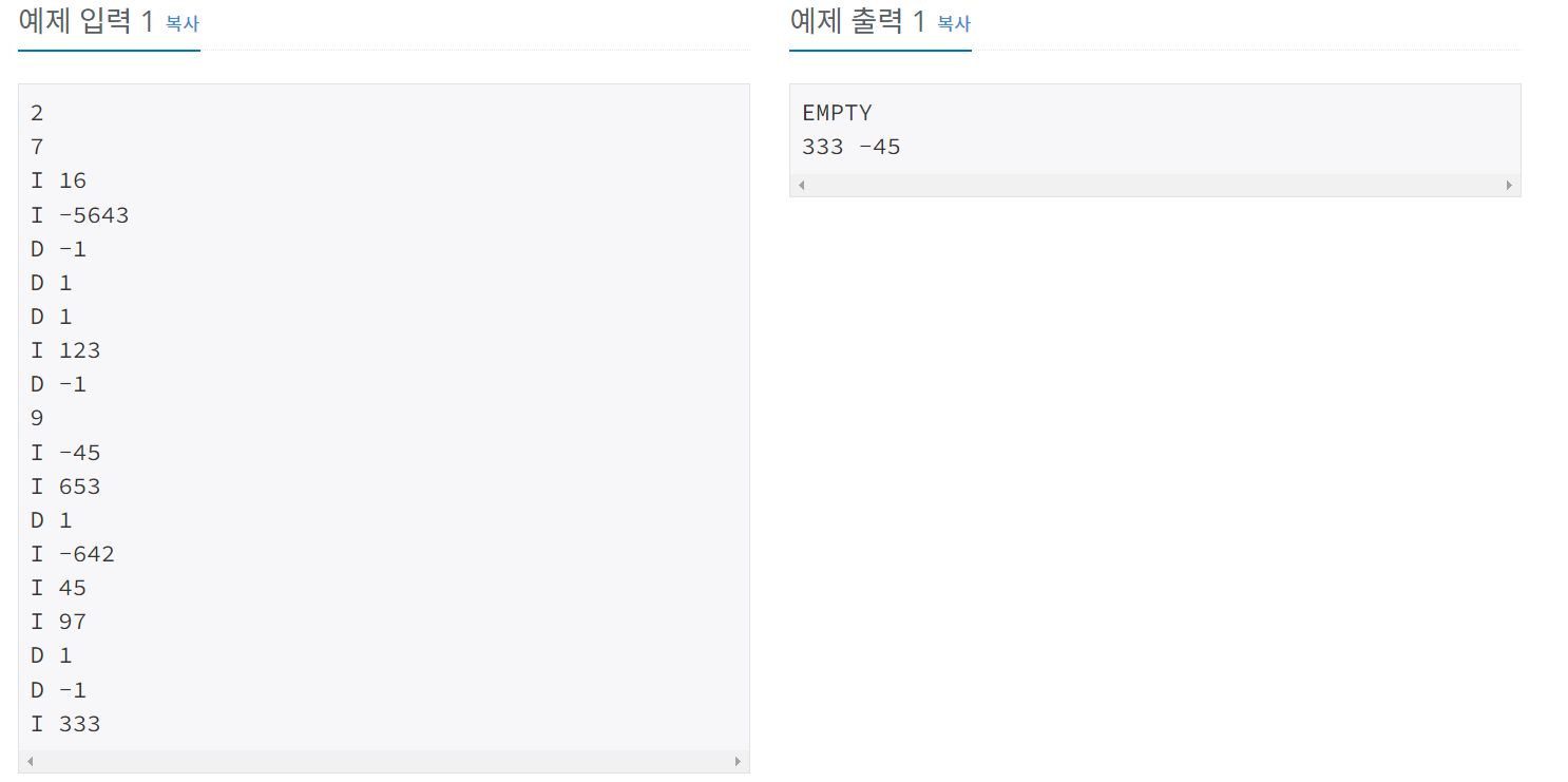 D연산의 경우 2가지로 나뉩니다. -1 or 1 이 입력되었을때 각각 최솟값, 최댓값을 삭제해주면 됩니다.