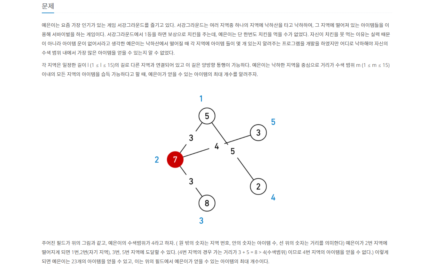 X번 지점에서 시작했을 때, 수색 범위 내에 얻을 수 있는 아이템의 최댓값을 구하는 문제입니다.
