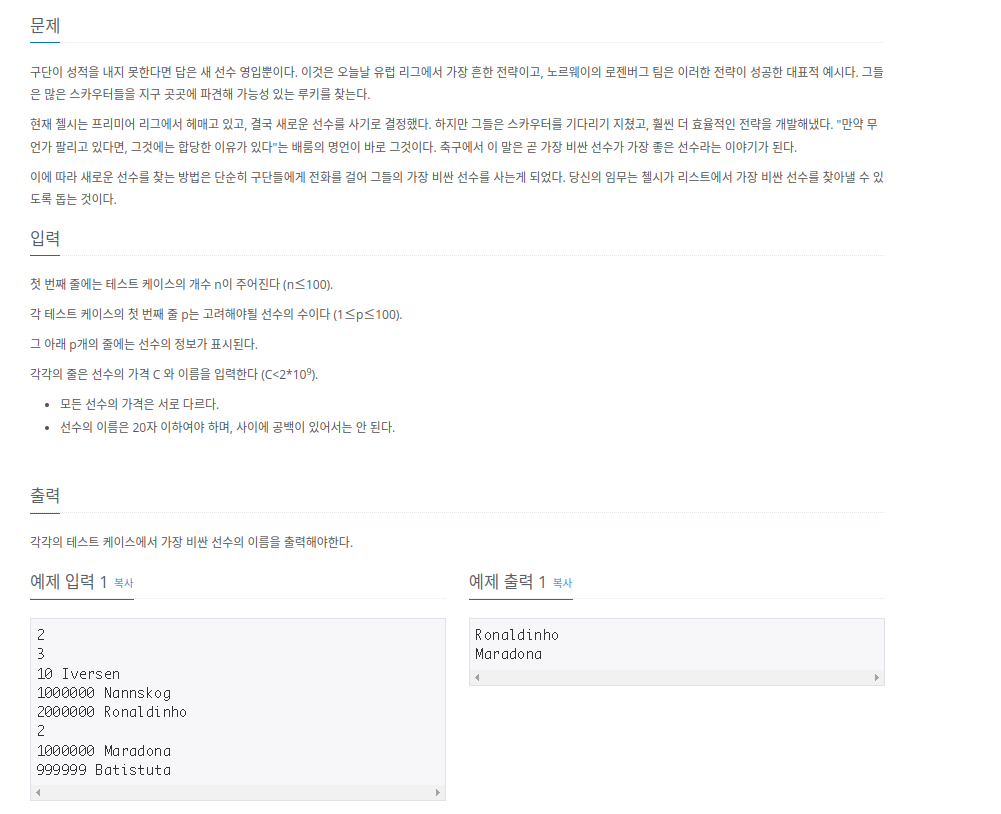 주어진 가격 중에서 가장 큰 가격을 찾아 해당 하는 선수를 구하는 내용입니다.