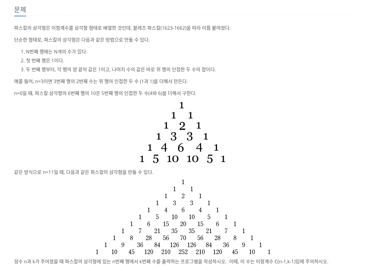 파스칼의 삼각형은 이항계수를 삼각형 형태로 배열한 것인데, 블레즈 파스칼(1623-1662)을 따라 이름 붙여졌다. 단순한 형태로, 파스칼의 삼각형은 다음과 같은 방법으로 만들 수 있다. N번째 행