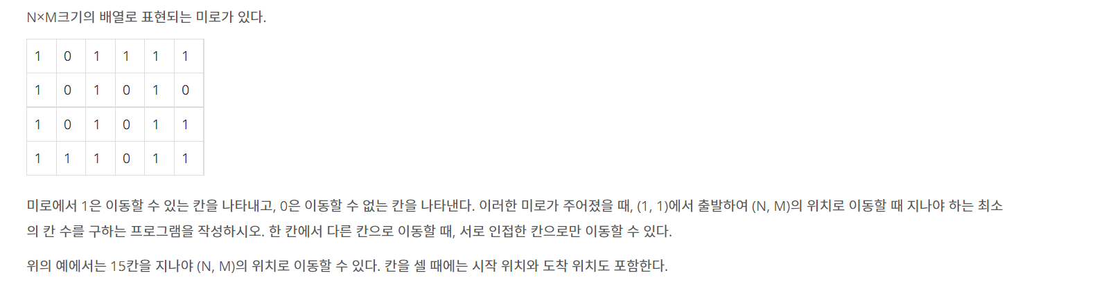 첫째 줄에 두 정수 N, M(2 ≤ N, M ≤ 100)이 주어진다. 다음 N개의 줄에는 M개의 정수로 미로가 주어진다. 각각의 수들은 붙어서 입력으로 주어진다.